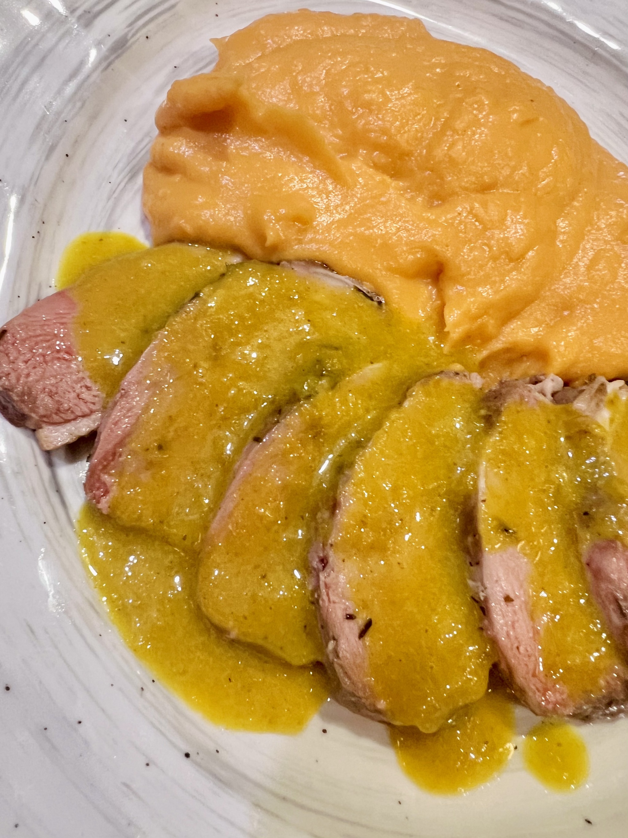 Короче, нетипичное. Рецепт, как на богатом, но из магнита у дома. Утиная грудка конфи под апельсиновым соусом с кремом из батата. Пишу, пока не улеглись впечатления.