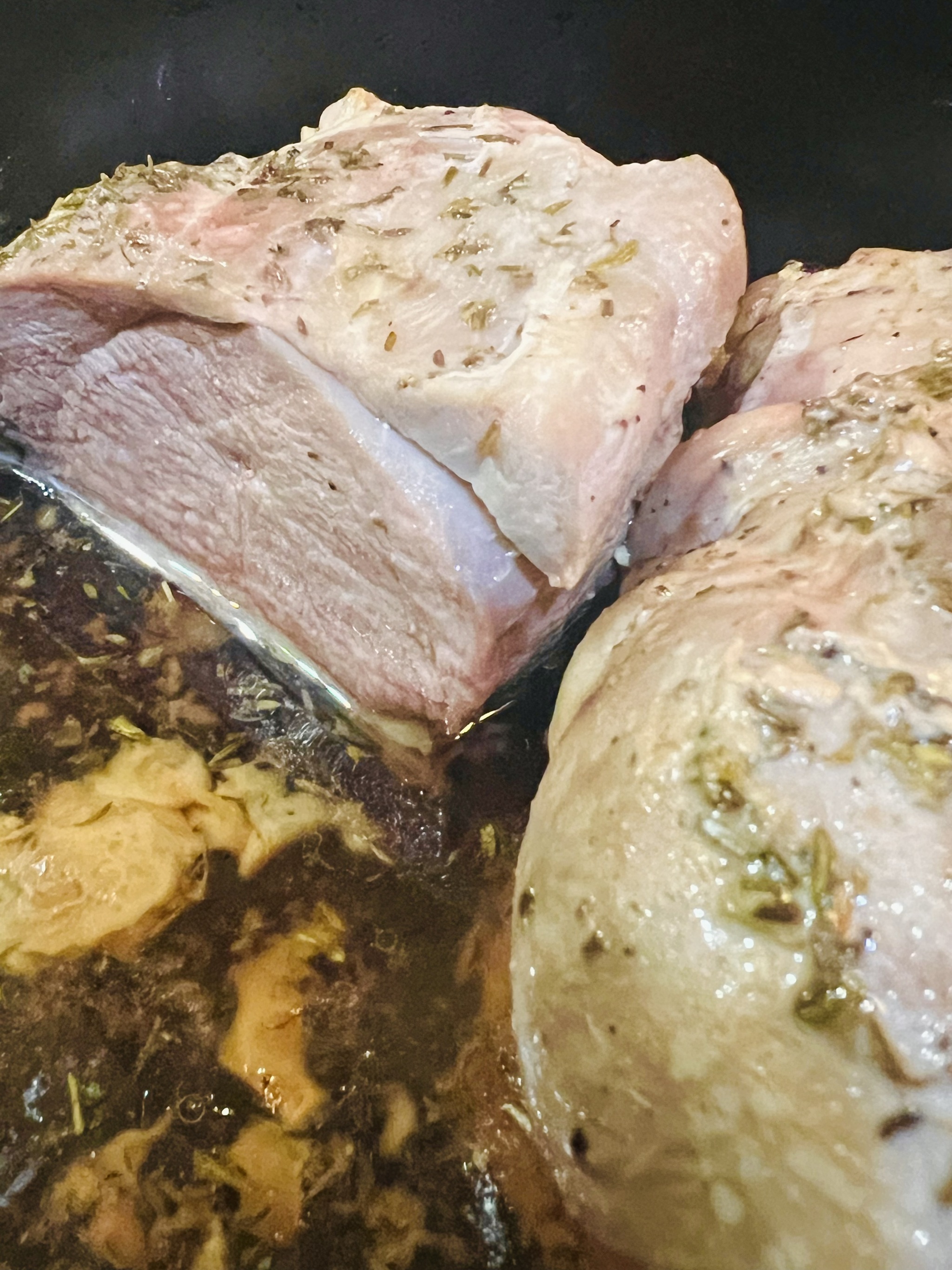 - Перекладываем грудку кожей вверх в форму для запекания, на дно которой насыпано немного тимьяна, поливаем жиром со сковороды. Запекаем 20-30 минут до внутренней температуры 54-56°C. Даем отдохнуть 10 минут.