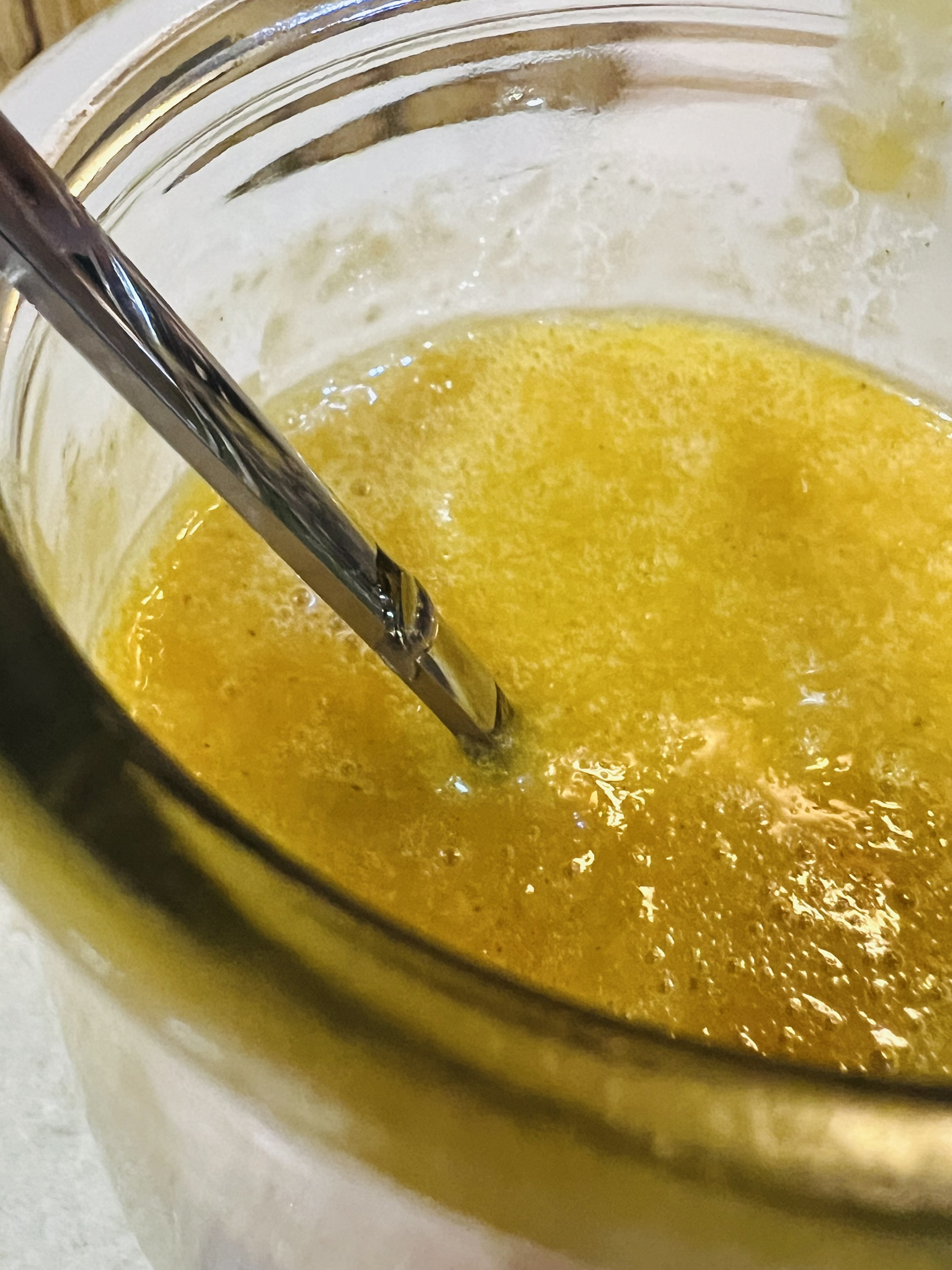 - В сковороду, где готовилась утка, добавляем мелко нарезанный лук, обжариваем до мягкости. Теркой снимаем с апельсина цедру, отжимаем сок. Вливаем сок к луку, туда же добавляем цедру и кусочек бульонного кубика. Упариваем на треть. Добавляем кусочек сливочного масла, но можно заменить его утиным жиром и соком, выделившимся при запекании. Пробиваем блендером до гладкости. Выравниваем вкус, добавляя мед.