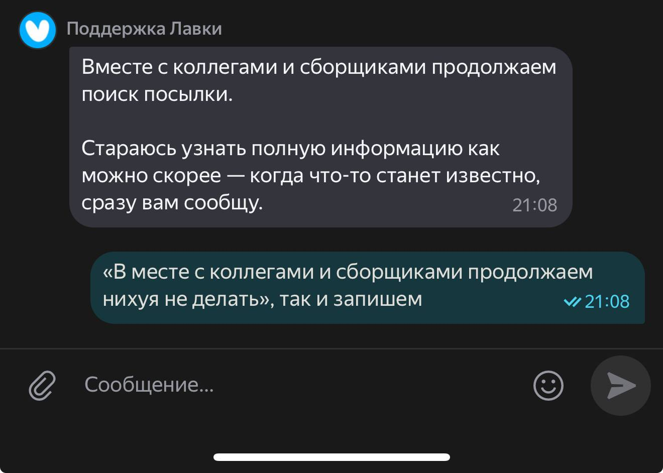 Поддержка в течении более 5-ти часов "уточняет информацию у коллег", читай "мы нихуя не делаем и надеемся, что проблема сама решится", но зато с барского плеча разрешили оставить ошибочную посылку мне - капсулы для похудения, видимо тонкий намёк от хуяндекса на следующий год