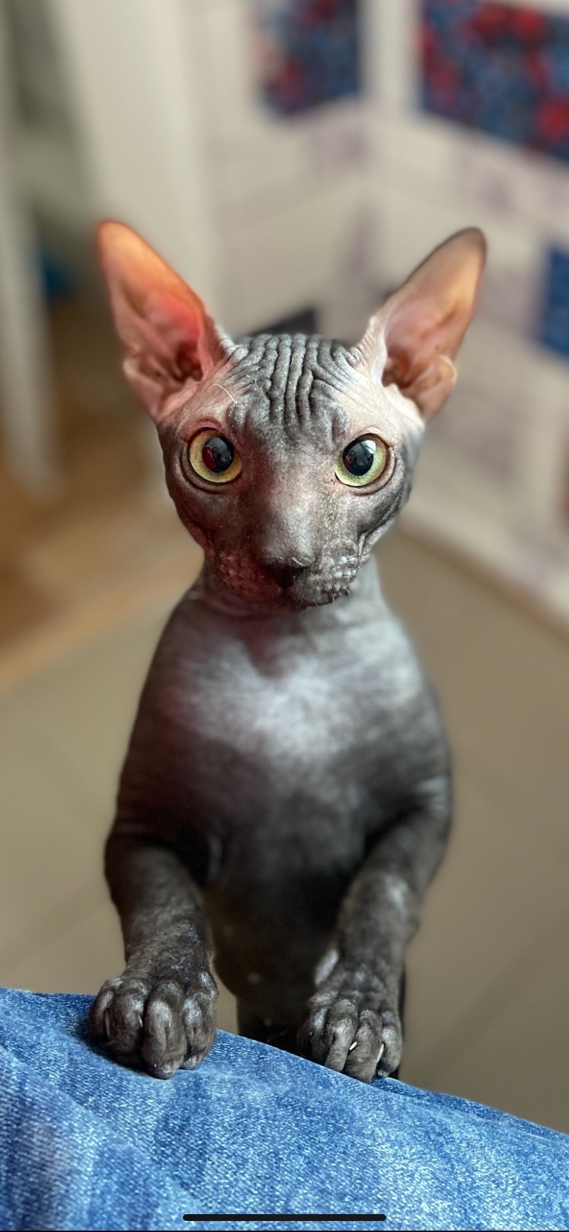 По наблюдениям за сфинксами в роликах из Интернета, а так же за своим котом, прихожу к выводу, что особенность породы заключается в том, что без общения со своим человеком они не могут. Мой кот любит сидеть у меня на руках, и при этом самозабвенно тереться одной своей щекой о мою небритую щетину, в другой о плечо. Очень тяжело переживает длительное отсутствие людей (например задержка на работе). Всегда встречает в прихожей и старается взобраться сразу на руки. И громко при этом мурлычет.