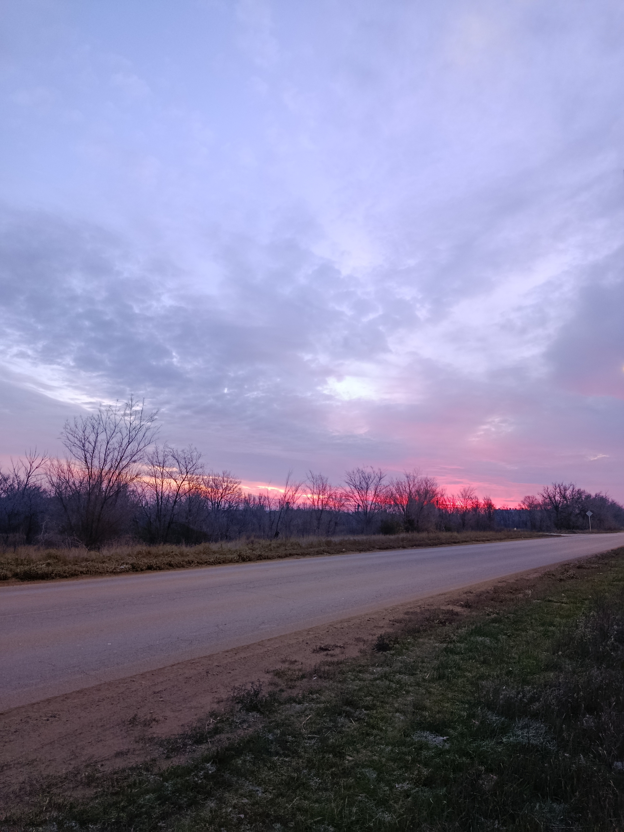 Такой рассвет я сегодня встретил по пути на работу, красота неописуемая! Морозный воздух, лёгкий ветерок и эта красота на восточной стороне. Из антропогенного - лента дороги, но мне так видится она усиливает контраст естественного, красивого природного и рукотворного. Первое создано на века и тысячелетия, а второе - без поддержки максимум лет 5-7.