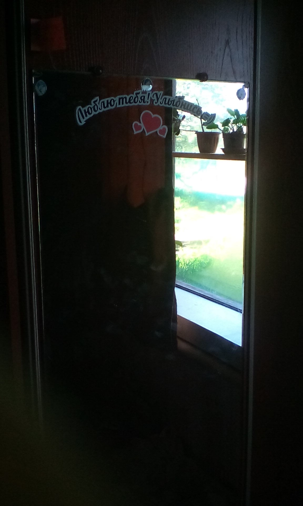 Пришел домой, дождался пока любимая погрузится в глубокий сон и приклеил это "художество" на зеркало, в которое она (как любая женщина), первым же делом смотрит с утра, как только встает с постели)).