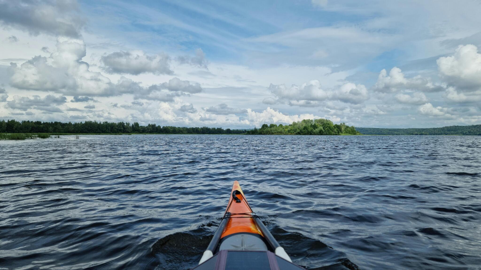 Оказавшись на прямом участке реки, я увидел на горизонте тяжёлые грозовые тучи, окрасившие часть неба в иссиня-свинцовый цвет. Не успел я оценить всю красоту этого предзнаменования, как тут же начал подниматься встречный ветер.