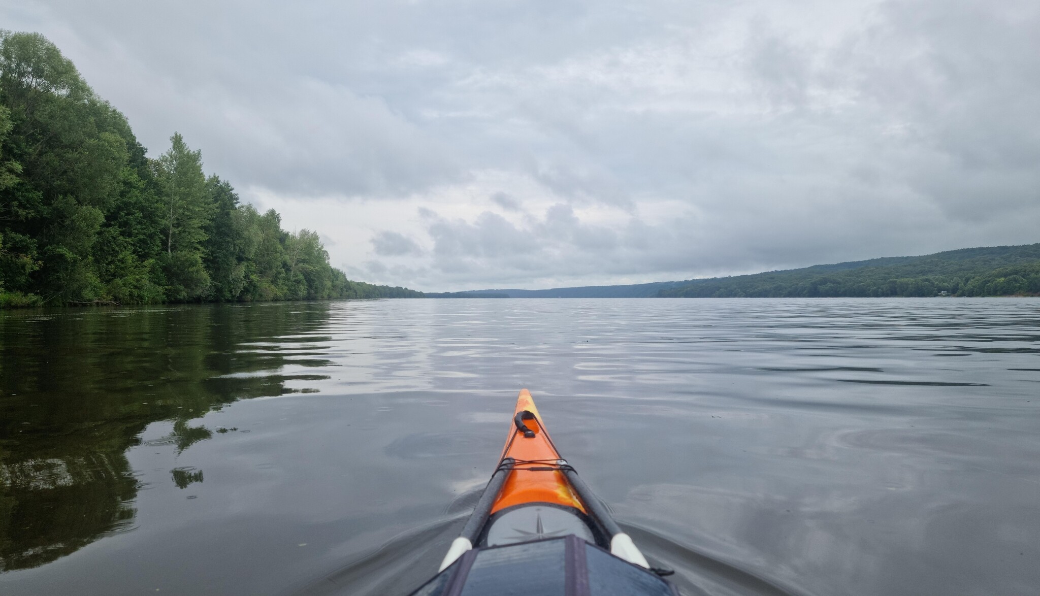 Нос каяка то подскакивал на гребне волн, то, резко опускаясь вниз, оказывался под водой. Солнечную панель несколько раз полностью залило. К счастью, пик непогоды был недолгим: волны быстро уменьшились, что позволило немного перевести дух. Продолжая бороться с остатками стихии, я увидел вдали поворот реки, которая в этом месте была разделена на две части огромным островом.