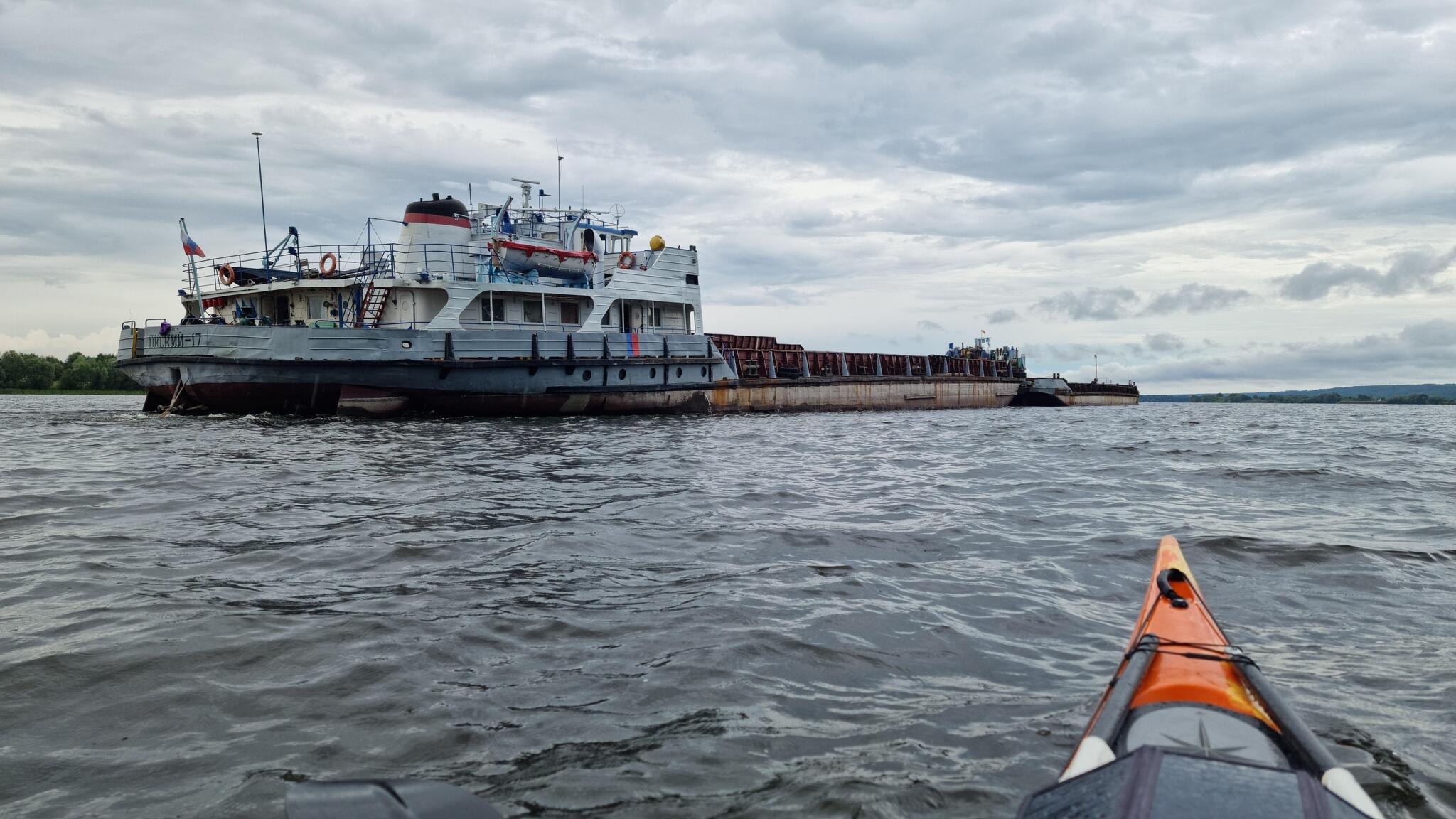 Проблема с этими водными монстрами, которую я отметил для себя ещё при ночном переходе перед Рыбинским водохранилищем, состоит в том, что их не слышно. Вообще. Буксир-толкач, который теоретически может издавать шум, находится на расстоянии ста, а то и двухсот метров позади (если баржа спаренная). Единственный способ не оказаться в подобной ситуации — почаще крутить головой, когда плывёшь по центру реки.