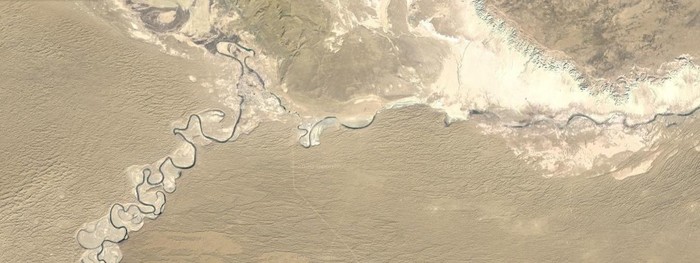 Спутниковый снимок участка среднего течения Узбоя. Также слабо проглядывается ровная светлая линия – это железная дорога «Казахстан-Туркмения-Иран»