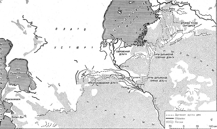Но в общем итоге к моменту прекращения существования Апшеронского моря 1 млн. лет назад русло тогдашней Амударьи проходило максимум, начиная со средней части долины современного Узбоя. Что происходило тогда с Аральской, Сарыкамышской и Хорезмской котловинами сказать сложно. Определенно там долгое время оставались какие-либо озера, когда Апшеронское море отступило. Воды Амударьи и даже Сырдарьи туда не поступали – судя по отложениям, имела место быть высокая соленость водоемов.