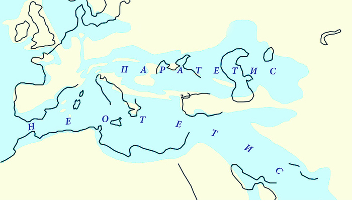 Сухопутная часть Киммерийской плиты, начав свое движение, образовала между собой и южной частью Пангеи, Гондваной, новую часть океана Тетис – Неотетис, который почему-то на самой первой из карт называется просто Тетис. Тогда как большая северная часть, Палеотетис, начала постепенно уменьшаться по отношению к южной. К чему это в итоге привело? Если посмотреть на 2-ю карту, то можно заметить, что нынешние Турция, Иран и Тибет просто «прижали» бывший Палеотетис к Евразии, тогда как Неотетис расширился до огромных размеров. Но можно заметить еще одну вещь: на территории Палеотетиса обозначены очертания Черного, Каспийского и Аральского морей. И здесь логика должна подводить читателя к верному выводу – именно Палеотетис когда-то был расположен на значительных территориях современных Центральной и Восточной Европы, а также Центральной Азии. В дальнейшем вслед за Киммерийской плитой дрейф на север совершили Индия, Аравия и Африка, сжав уже Неотетис, образовав на его месте Альпийско-Гималайский складчатый пояс. Постепенный подъем Альп, гор Греции и Анатолии, Загроса, Гиндукуша не только уменьшали бывший Неотетис, но и все больше разрывали связь между двумя частями когда-то единого Тетиса. Так уже 30 млн. лет назад ученые выделяют северную часть Паратетис, который «раскинулся от Парижа до Алтая».