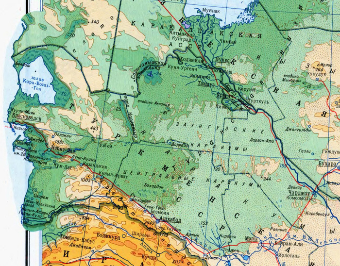 Западнее Сарыкамышского и Аральского озер располагается огромное пустынное и загадочное плато Устюрт, разделяющее геологические структуры Арала и Сарыкамыша от котловины Каспийского моря — и снова нет места для их связи. Но вот южнее есть интересные нам географические объекты. Среди них особенно выделяется пустыня Каракумы (она же Каракум), занимающая превалирующую часть Туркмении и питающая её экономику за счет больших запасов нефти и газа. И именно ее нам стоит рассмотреть.