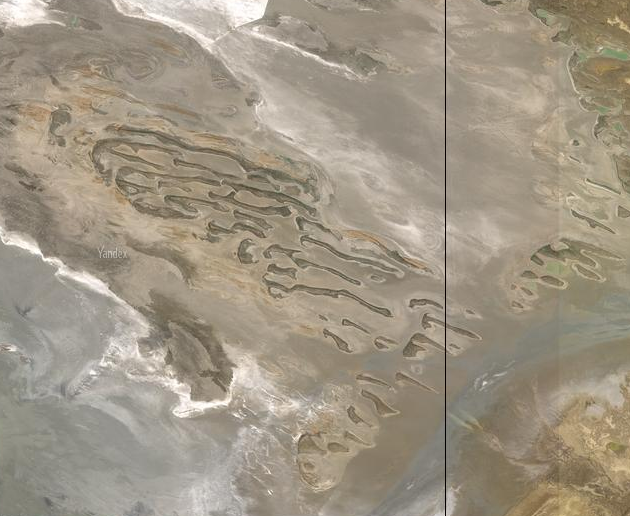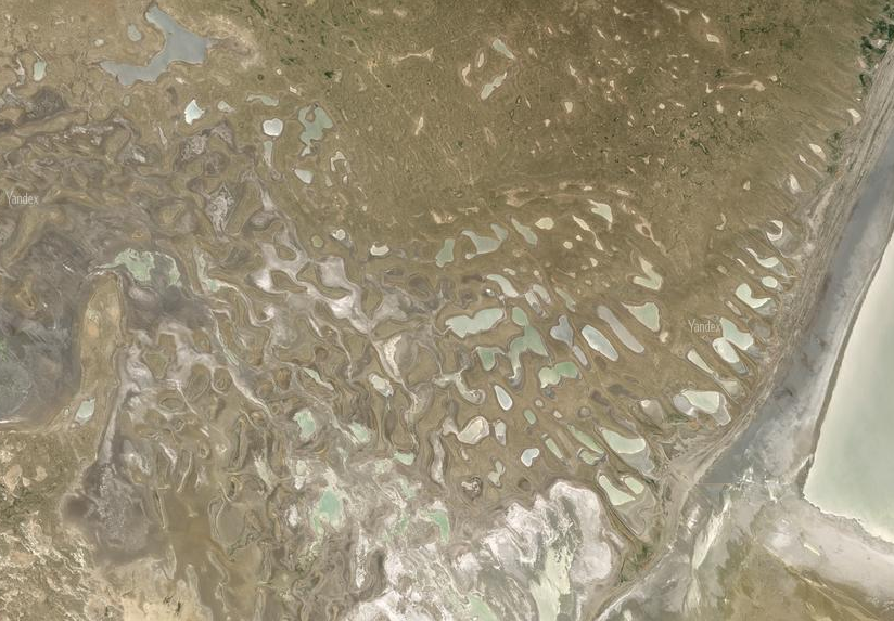 Спутниковый снимок участка среднего течения Узбоя. Также слабо проглядывается ровная светлая линия – это железная дорога «Казахстан-Туркмения-Иран»