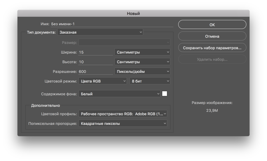 Поэтому создаём изображение 15 на 10 сантиметров, 600 пикселей на дюйм: