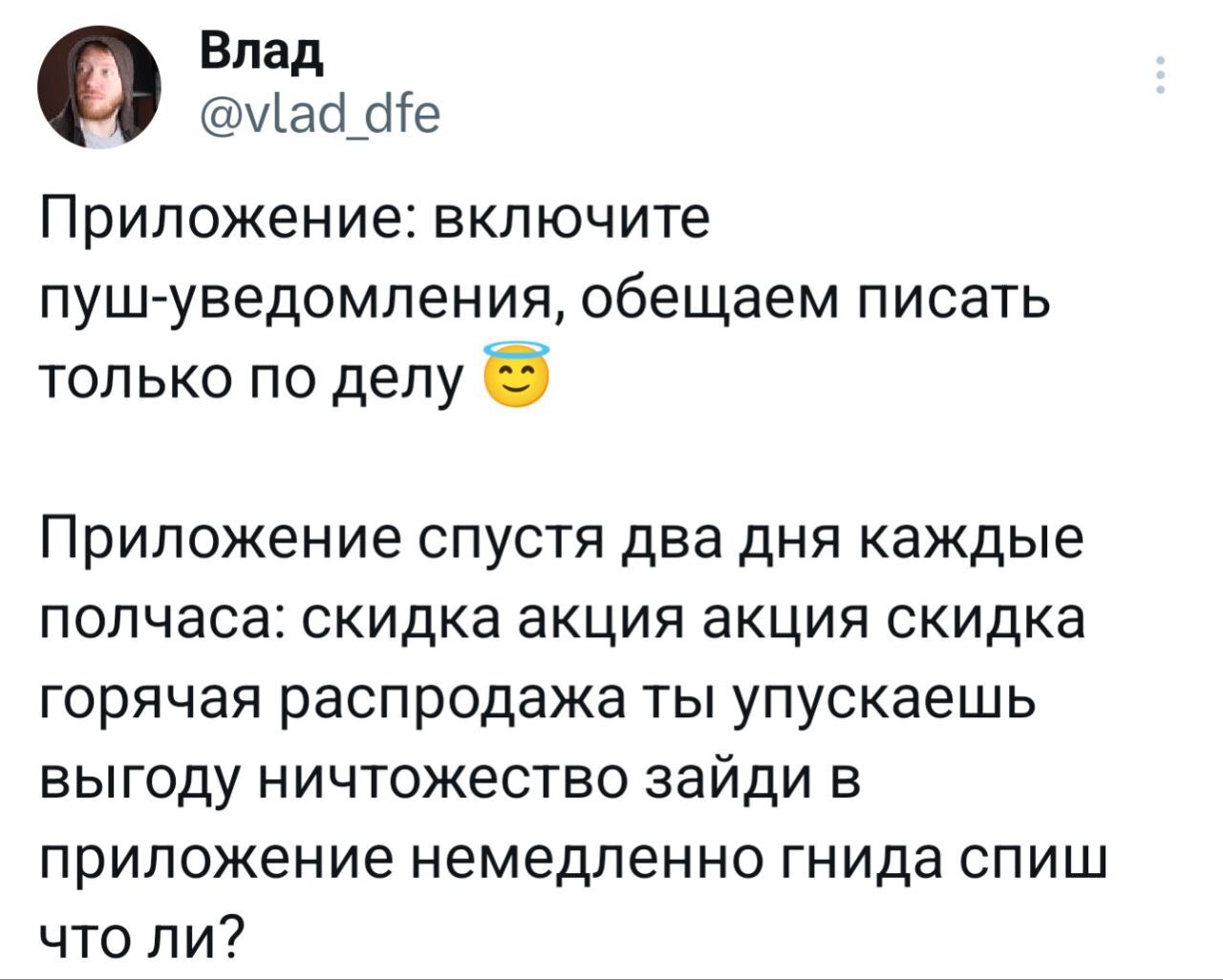 5770 prodneupal Уже много лет у меня выключены абсолютно все уведомления1 1 год назад Звуки, всплывашки, звонки, циферки с количеством новых сообщений. Никто не сможет привлечь мое внимание, если я этого не захочу. Исключение — звонки от пяти членов семьи. А кто достоин права вас нотифицировать? Уведомление Push-уведомления Личное пространство Vlad DFE - Twitter X (Twitter) Скриншот Текст 108 23 8 8 Ещё 0