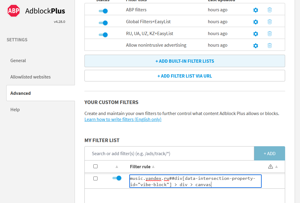 Возможно правило подходит и для других блокировщиков. Не проверял. Можете в коммент написать версию для своего.