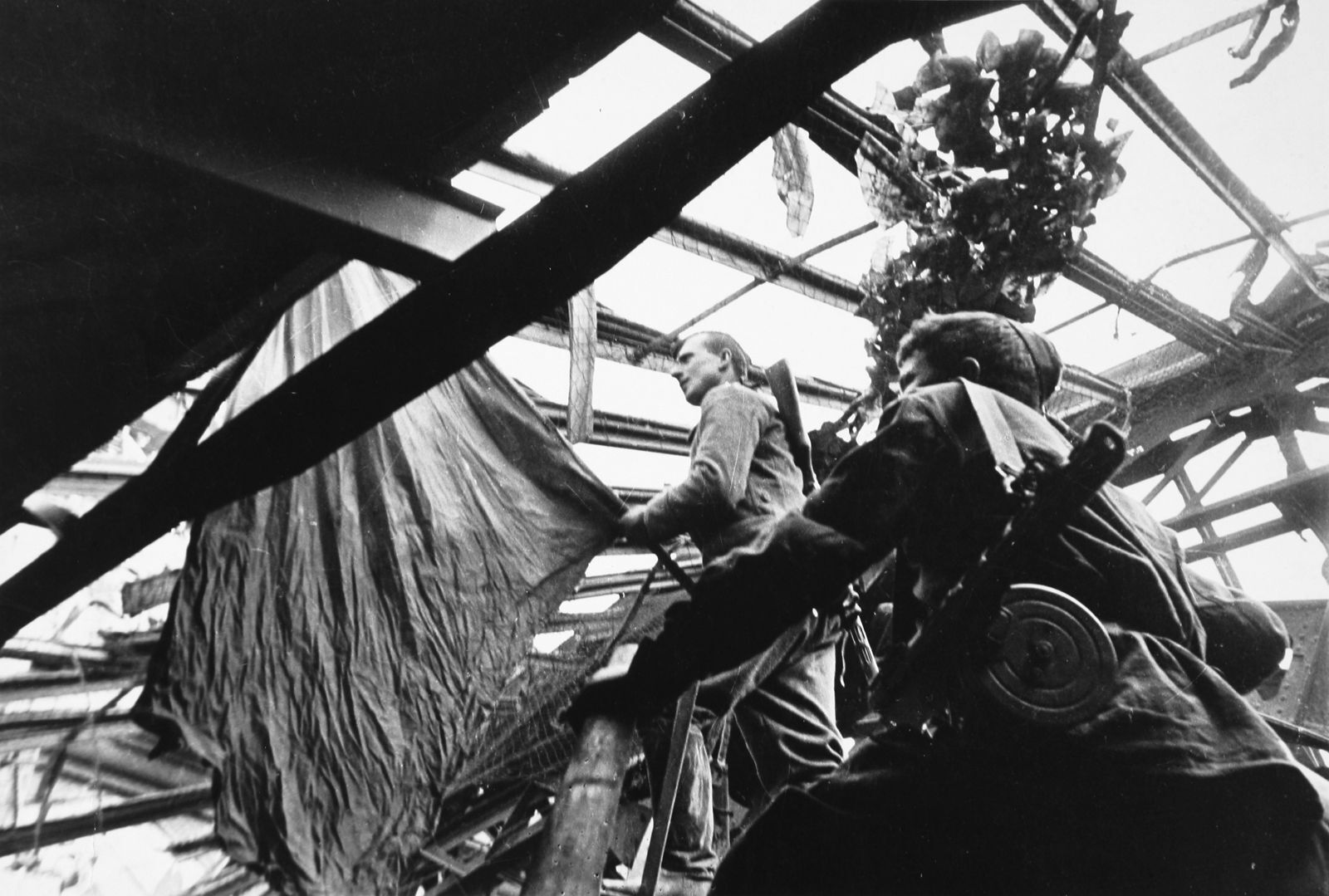 Михаил Егоров и Мелитон Кантария выходят со знаменем на крышу Рейхстага. 1 мая 1945 года. Фото - Анатолий Морозов