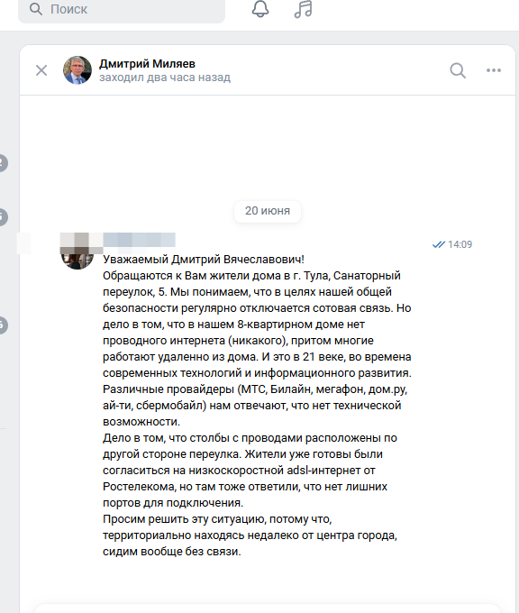Жители дома на Санаторном переулке обращались на единую линию губернатора, написали обращения в министерство цифрового развития и связи Тульской области, Роспотребнадзор, администрацию города. Из министерства позвонили и сказали, что все местные компании связи ссылаются на то, что подключить дом нет технической возможности. Якобы Ростелеком может подключить только адсл (хотя в самой компании все время твердят обратное). А если хотим оптоволокно с хорошей скоростью, то Ростелеком это сделать может за 120 тысяч рублей! (хотя до ближайших домов всего несколько метров).