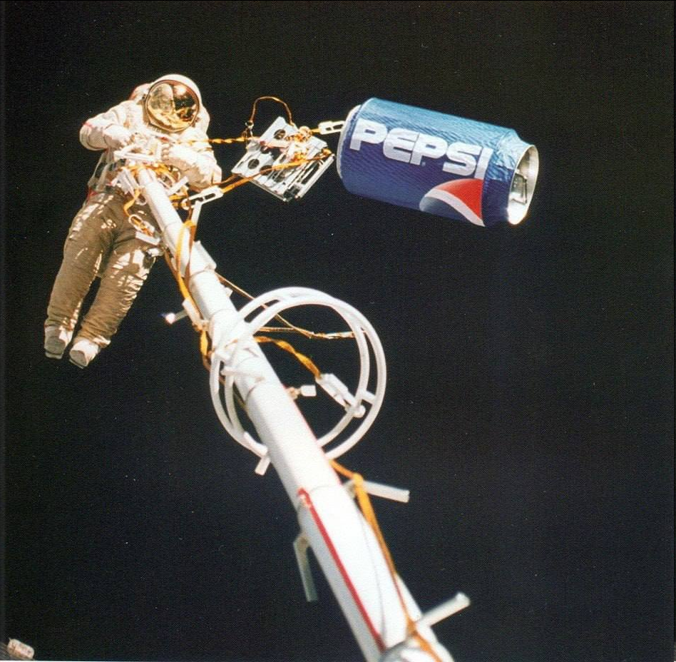 В мае 1996 года космонавты Юрий Онуфриенко и Юрий Усачёв во время выхода в открытый космос запустили в безвоздушное пространство гигантскую алюминиево-нейлоновую банку Pepsi. Видеоматериалы для рекламы были отсняты, но ролик так и не вышел в эфир, потому что позже Pepsi изменила дизайн банки. Поэтому выполненная в "старом" дизайне акция уже не устраивала маркетологов.