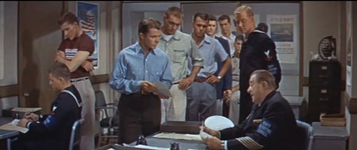 Оди Мёрфи на призывном пункте, кадр из фильма «В ад и назад». Несмотря на прошедшие годы, он по-прежнему сильно проигрывает в габаритах актёрам, играющим призывников