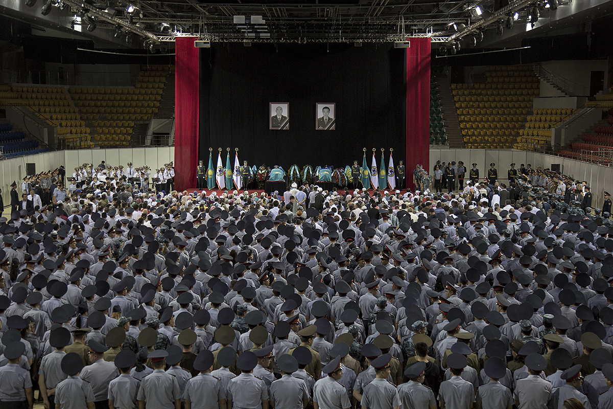 Четверо из шести погибших - полицейские Бауыржан Нурмаханбетов, Максат Салимбаев и Тимур Бегасилов, а также пенсионер МВД Азамат Азимханов - будут похоронены сегодня не в Алматы. Во Дворце спорта прощаются с погибшими полицейским Аяном Галиевым и пограничником Гани Нуримановым.