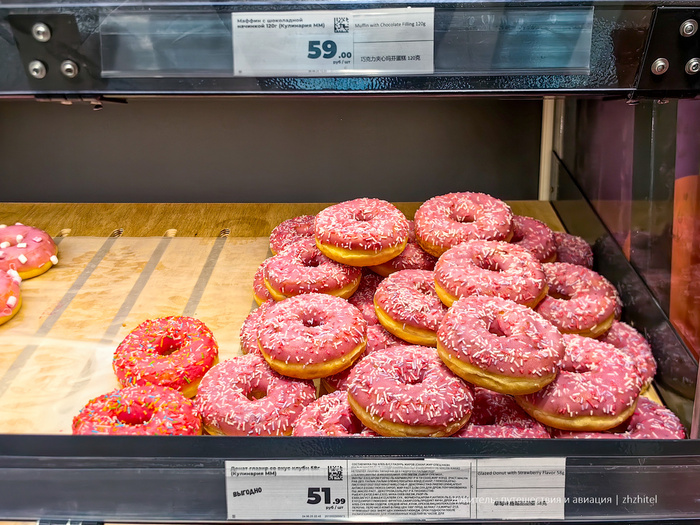 Есть выпечка, которую пекут или доводят до кондиции тут же. Правда, к моему приходу почти всё смели. Остались маффины и донаты по смешным для аэропорта ценам.
