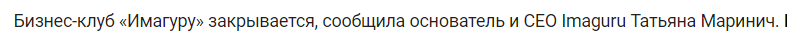 Бизнес-клуб «Имагуру» закрывается, сообщила основатель и CEO Imaguru Татьяна Маринич. По ее словам, холдинг «Горизонт» расторгает договор аренды в одностороннем порядке без объяснения причин.