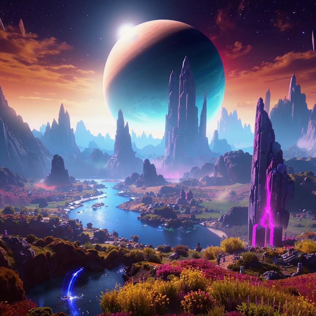 Планета Экзар была покрыта густыми лесами, состоящими из деревьев с листьями, похожими на перламутровые зеркала. Эти деревья отражали свет звезды, создавая причудливые узоры на поверхности планеты. Под этими деревьями протекали реки из жидкого серебра, которые, казалось, текли вверх по склонам гор.
