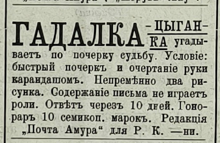 6 molva.press Российская империя В «Битву экстрасенсов» 10 месяцев назад Газета «Почта Амура», 1906 г. ГАДАЛКА — ЦЫГАНКА угадывает по почерку судьбу. Условие: быстрый почерк и очертание руки карандашом. Непременно два рисунка. Содержание письма не играет роли. Ответ через 10 дней. Гонорар 10 семикоп. марок. Редакция „Почта Амура“ для Р. К. —ни. [моё] Старая газета Брачная газета Цыгане Гадалка Битва экстрасенсов 1906 Ещё 0
