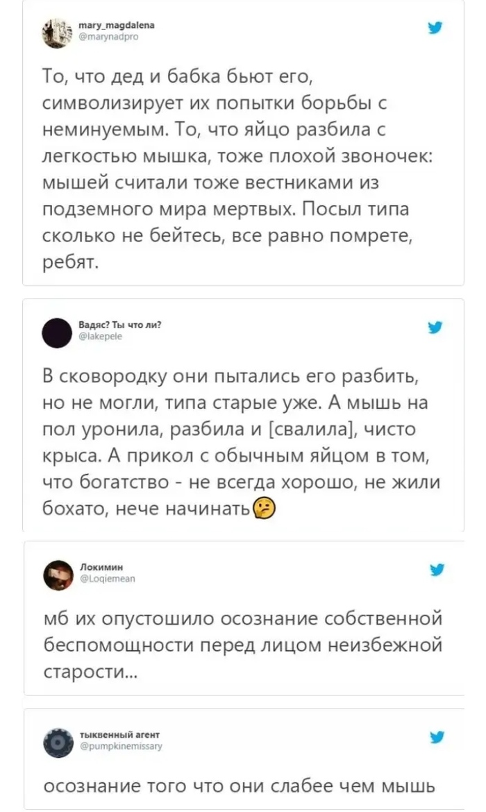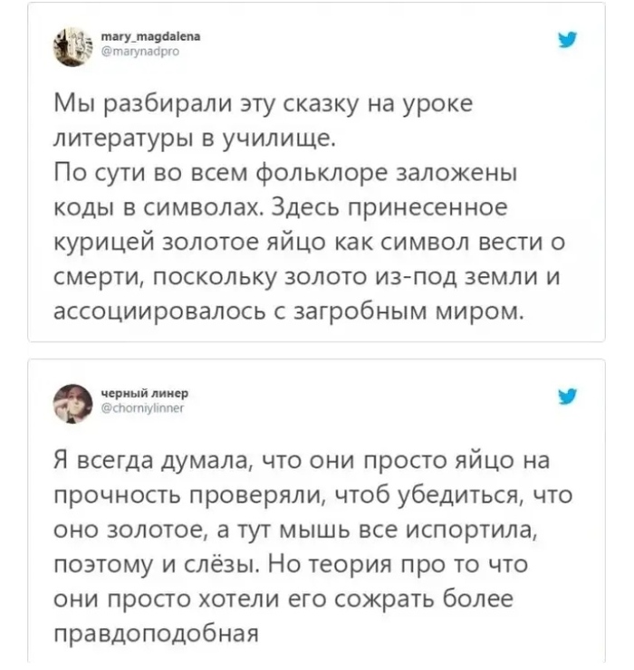 Кто бы мог думать, что в интернете много лет разворачиваются философские дискуссии на тему "а какой смысл заложен в сказке?". Зачем бабка и дед хотели разбить золотое яичко? Почему вдруг так расстроились, когда мышка его разбила, ведь они сами тоже хотели его разбить?