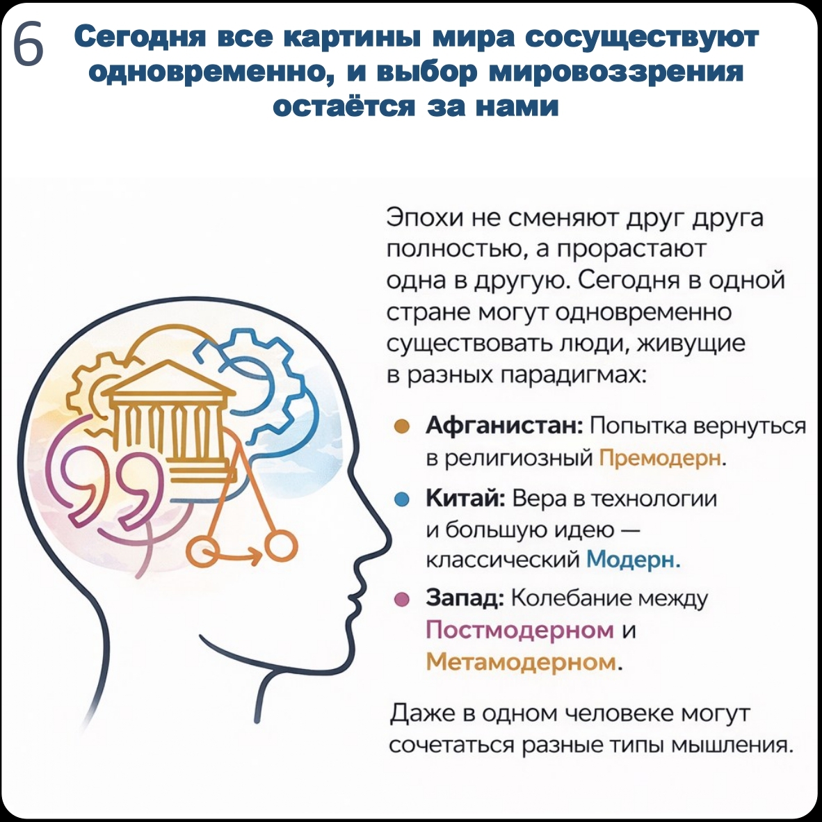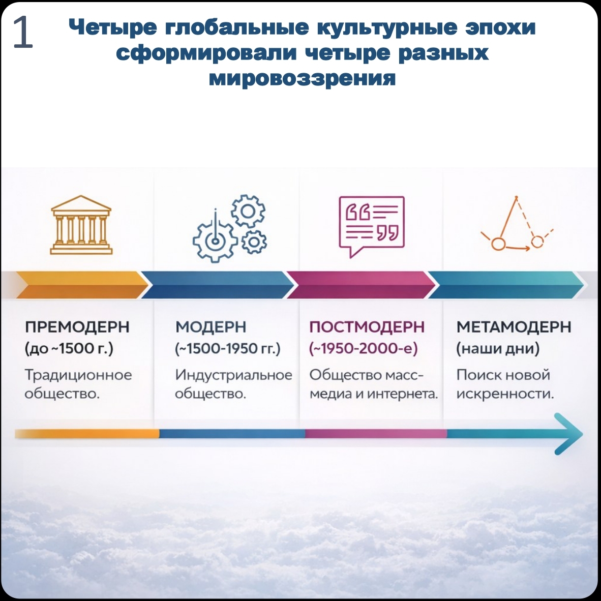 Эпохи эти никуда не делись. Мы живем в мире, где разные мировоззренческие постулаты могут уживаться в голове одного человека. И хорошо бы понимать, какой из них в какой момент управляет нашими решениями, страхами, ожиданиями и образом будущего. Для этого сделал картчоки с инфографикой. Еще больше тем можно увидеть в канале https://t.me/fromredline