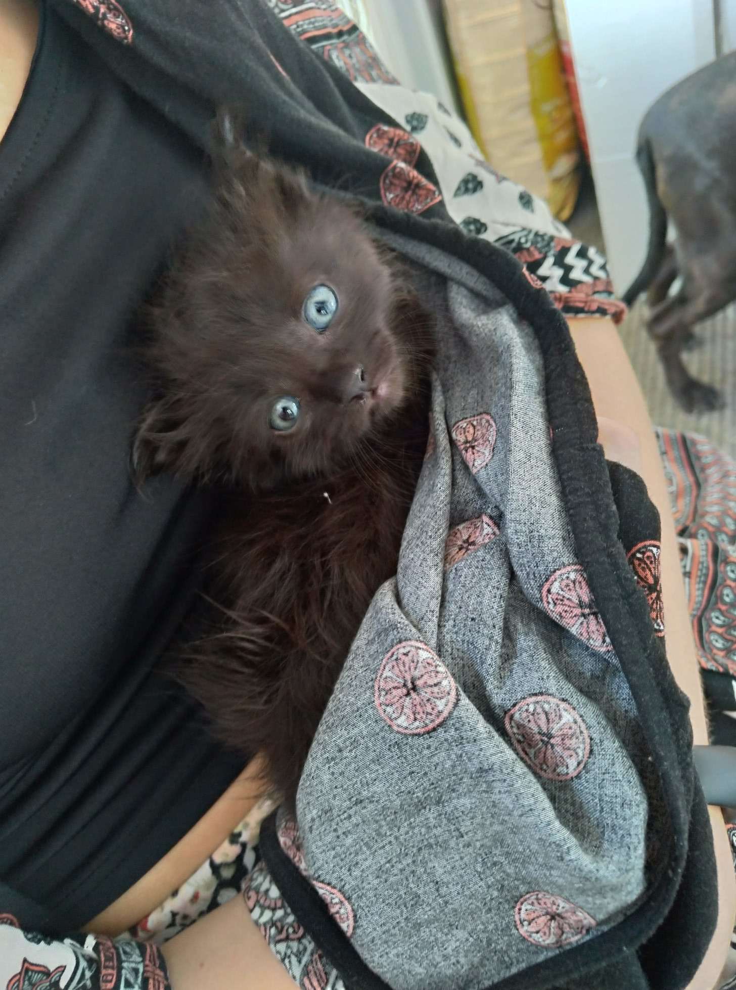 Час назад нашли котю. Глазки и шерсть чистые. Размером с ладошку.