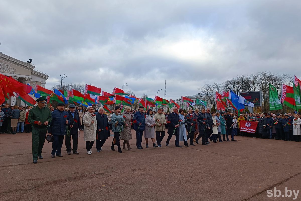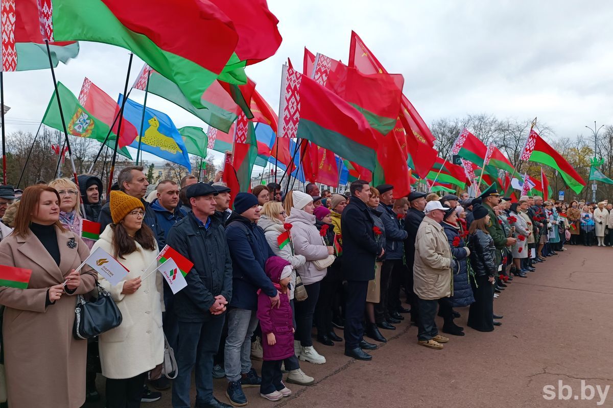 106-ю годовщину Октябрьской революции в Гомеле встретили торжественным митингом на главной площади города, носящей имя Владимира Ильича Ленина. У памятника вождю мирового пролетариата собрались сотни жителей областного центра, для которых, как и в далеком 1917 году, все так же важны такие идеалы, как справедливость, труд, и равенство.