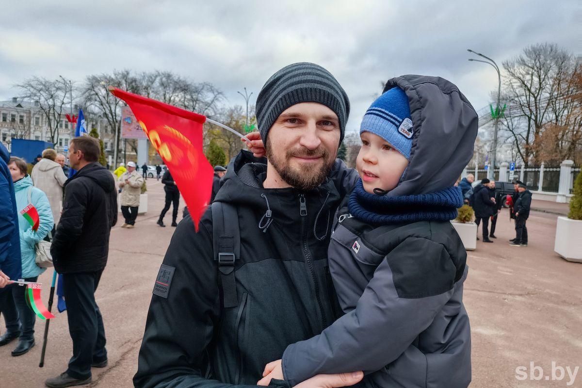 Гомельчанин Виталий Москвичев пришел на митинг вместе с четырехлетним сыном Димой, который весь митинг уверенно сжимал в детских ладошках флаг СССР. Сам же Виталий признается, что в этот день отправился на площадь по зову сердца: