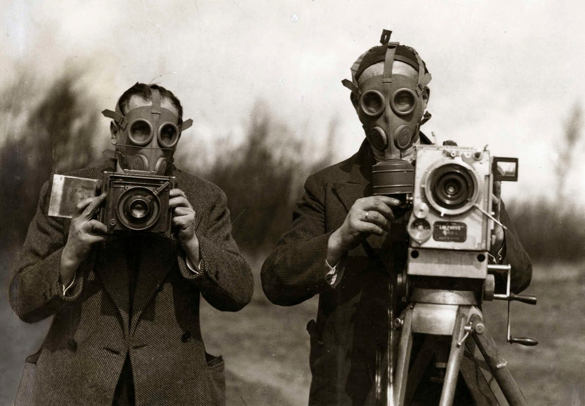 Фотограф и оператор в противогазах во время съёмок военных учений. Бельгия, 1933 год.