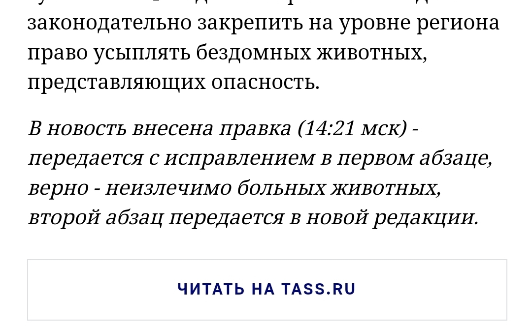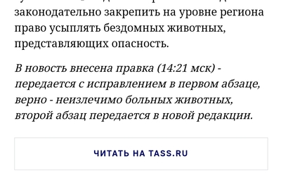 "Согласно тексту законопроекта, муниципалитеты наделяются полномочиями по усыплению безнадзорных животных в двух случаях, они нападали на людей или проявляли немотивированную агрессию. Также можно усыплять неизлечимо больных или травмированных животных или носителей возбудителя опасной болезни."