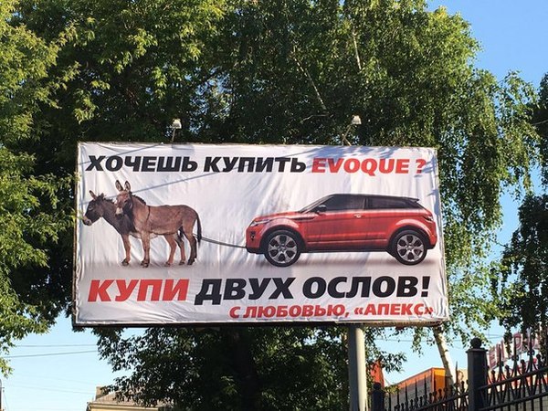 Автором и заказчиком «антирекламы» стала одна из клиенток, которая осталась недовольна работой дилерского центра «Апекс». Баннеры были размещены неподалёку от здания, в котором располагается автоцентр. На одном из них нарисован автомобиль Range Rover Evoque, который взяли на буксир два ослика. Надпись не менее забавная: «Хочешь купить Evoque? Купи двух ослов! С любовью, Апекс». Второй баннер с тыквой позабавил автомобилистов не меньше: «Окунись в сказку! Купи Range Rover Evoque и через 37000 км твоя карета превратится в тыкву! С любовью, Апекс»