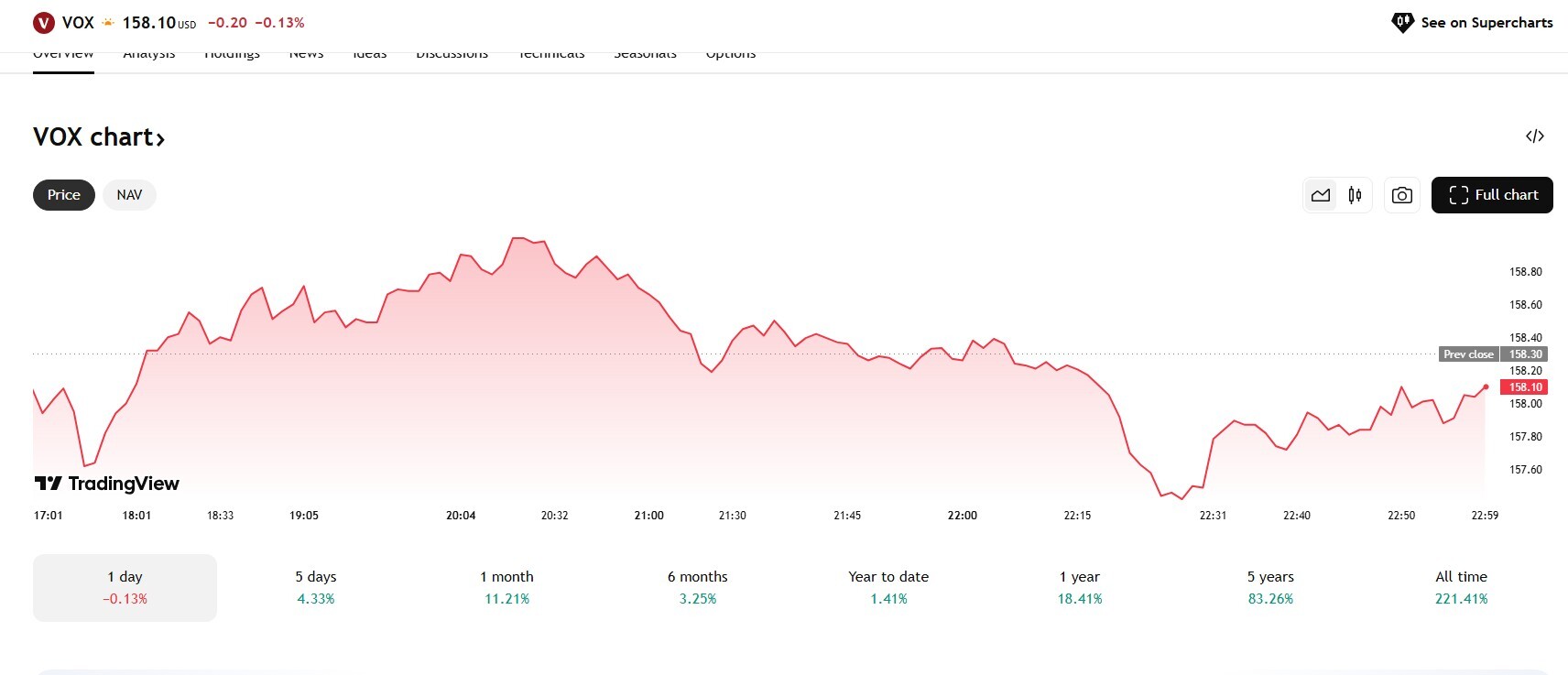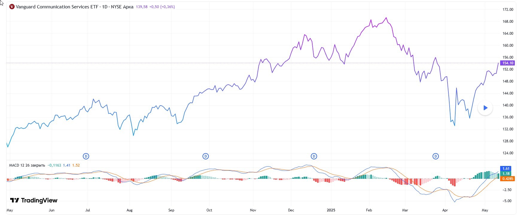 Для тех, кто предпочитает более широкий подход, предлагает диверсифицированный доступ к сектору коммуникаций Vanguard Communication Services ETF, отслеживающий индекс Communication Services Select Sector Index. Этот ETF включает в себя смесь бумаг отраслевых гигантов, таких как Verizon, AT&T и Уолт Дисней. Привлекательность VOX заключается в его способности улавливать тенденции в масштабах всего сектора, одновременно снижая риски, характерные для конкретной компании.