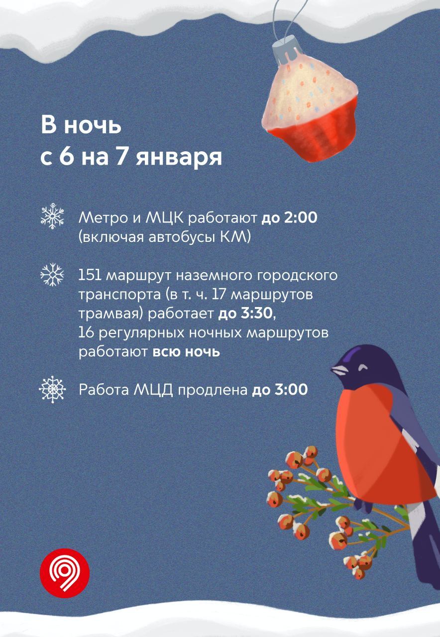 На Рождество метро и МЦК будут работать до 02:00, МЦД — до 03:00, 151 маршрут автобусов, электробусов и трамваев — до 03:30 и 16 — всю ночь.