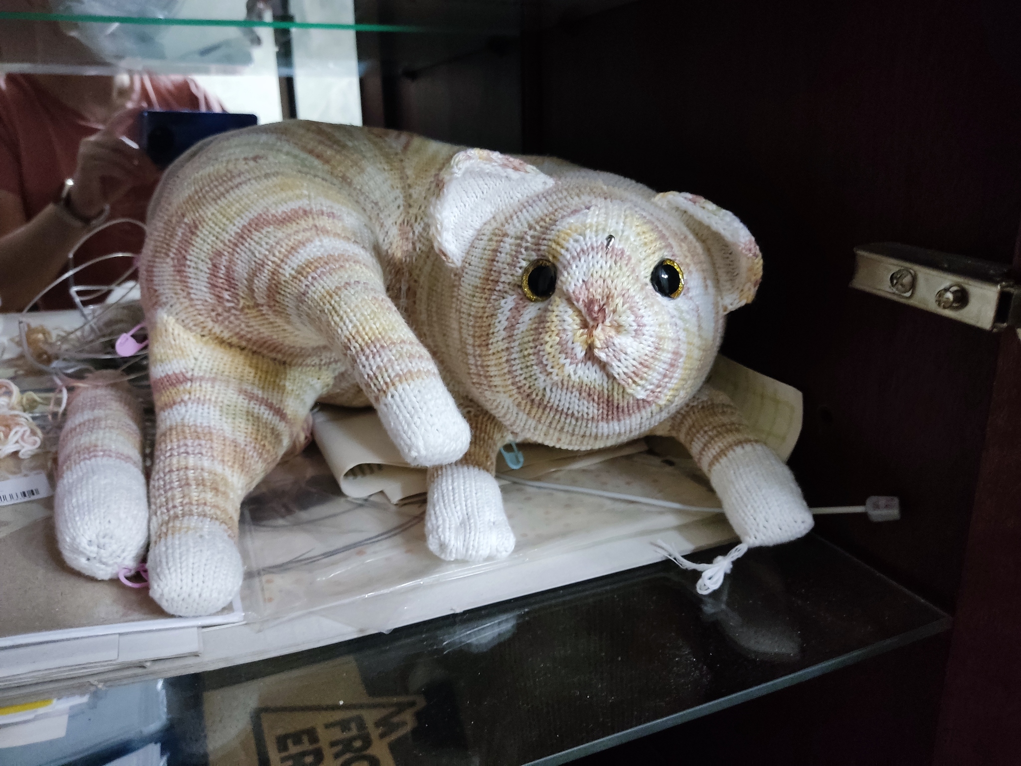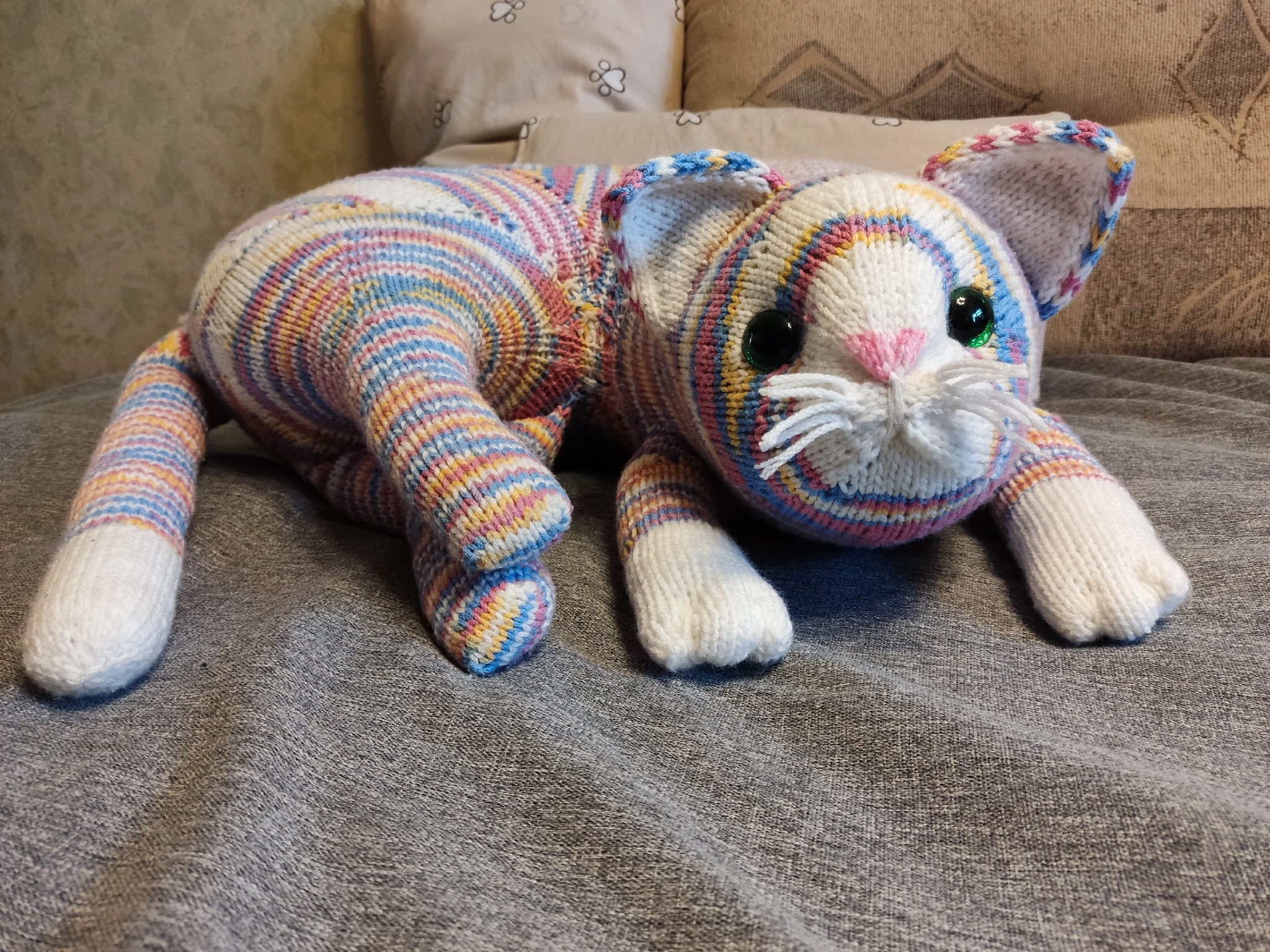 Это второй кот такой модели. Первый вязался по фану. Я не рассчитала толщину пряжи и спиц и получился другой кот, более ... Сильно более. Но сравнить не могу, тот был продан на школьной благотворительной ярмарке по цене наполнителя.