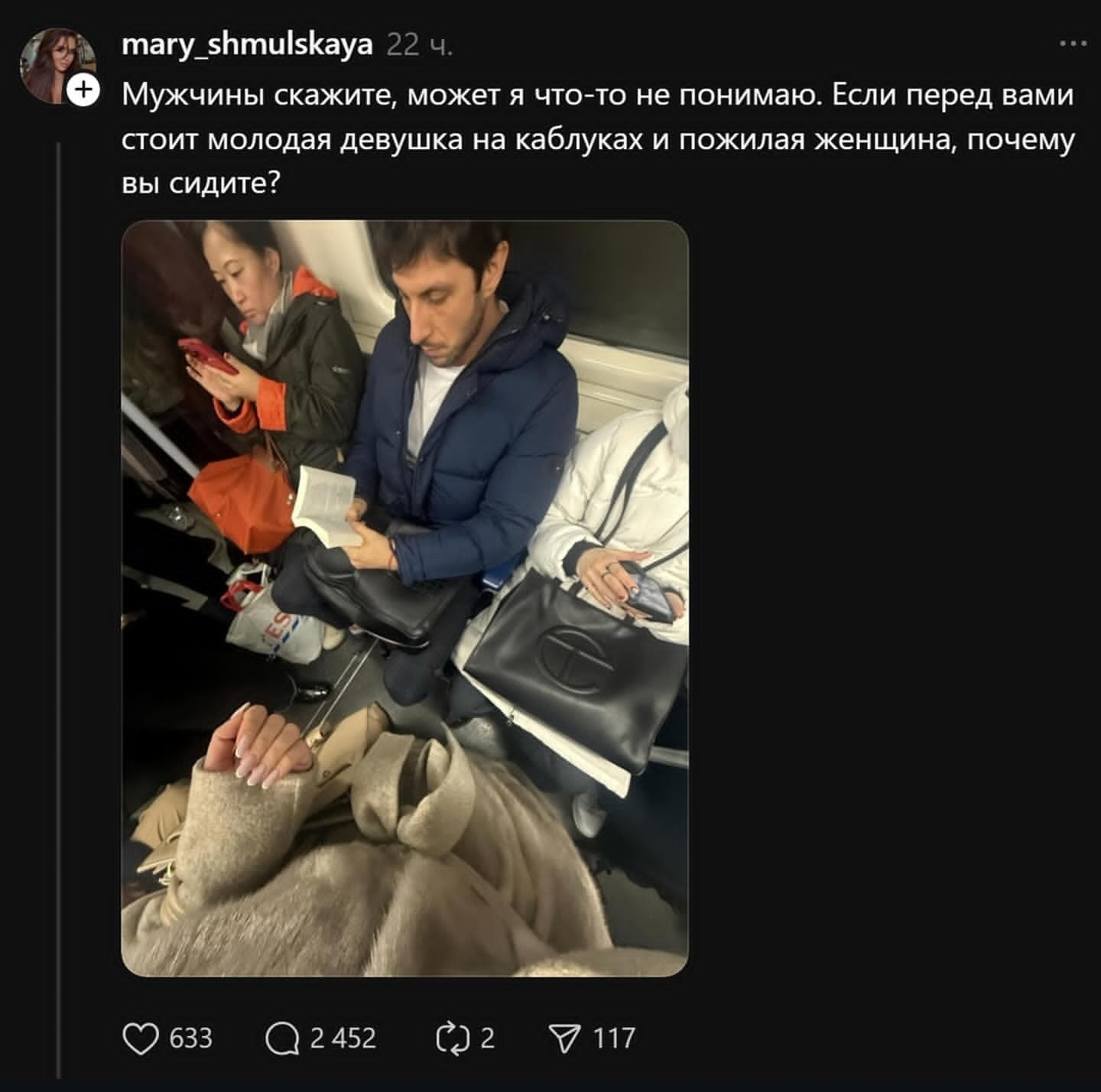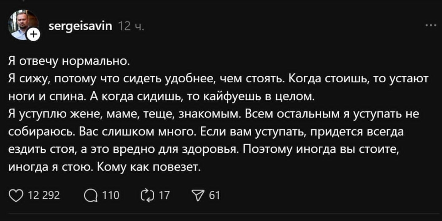946 Ryl0n.0b0ev ДЕД ИНСАЙД Баяны Отношения В общественном транспорте все равны4 2 месяца назад Ну кроме беременных женщин и совсем уж дряхлых стариков. Мужчины и женщины Общественный транспорт Скриншот Комментарии Волна постов 143 61 30 7 4 3 Ещё 1