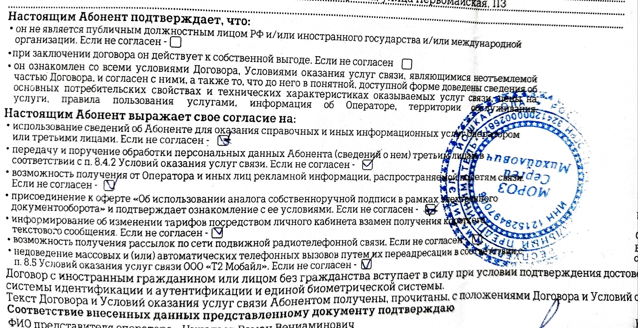 Создалось полное впечатление, что все это намеренно так долго делается для того, чтобы человек устал, плюнул и попросил уже поскорее его отпустить, дав согласие на все условия. Но ведь это не какой-то необычный договор, а вполне базовый, который даётся каждому второму клиенту. Очень неприятно, что теле 2 всеми силами хочет протолкнуть все свои условия, абсолютно не считаясь с запросами клиентов. (Я понимаю, что скорее всего многие договор не читают даже, но уверена, что мой случай далеко не единственный, когда человек пытался отказаться от такого рода согласий).