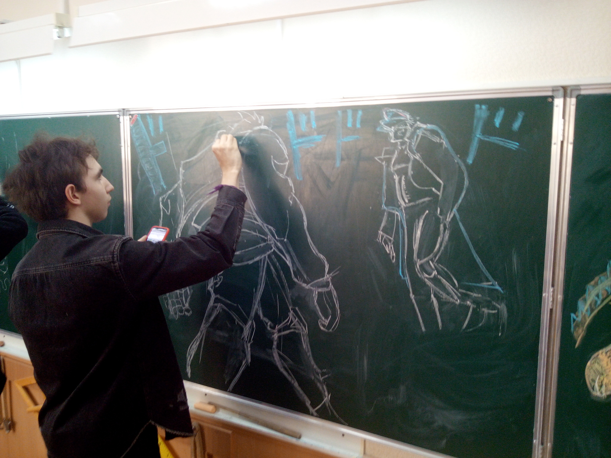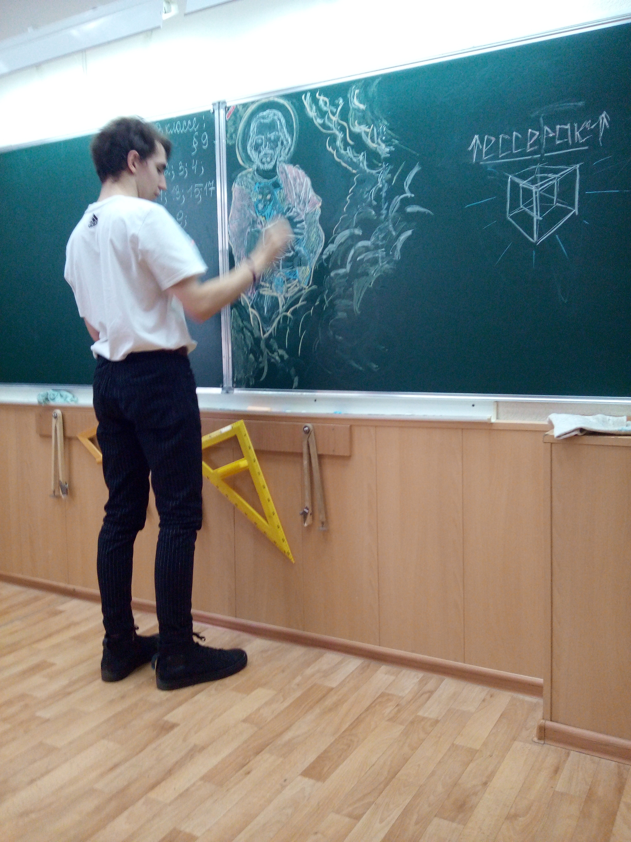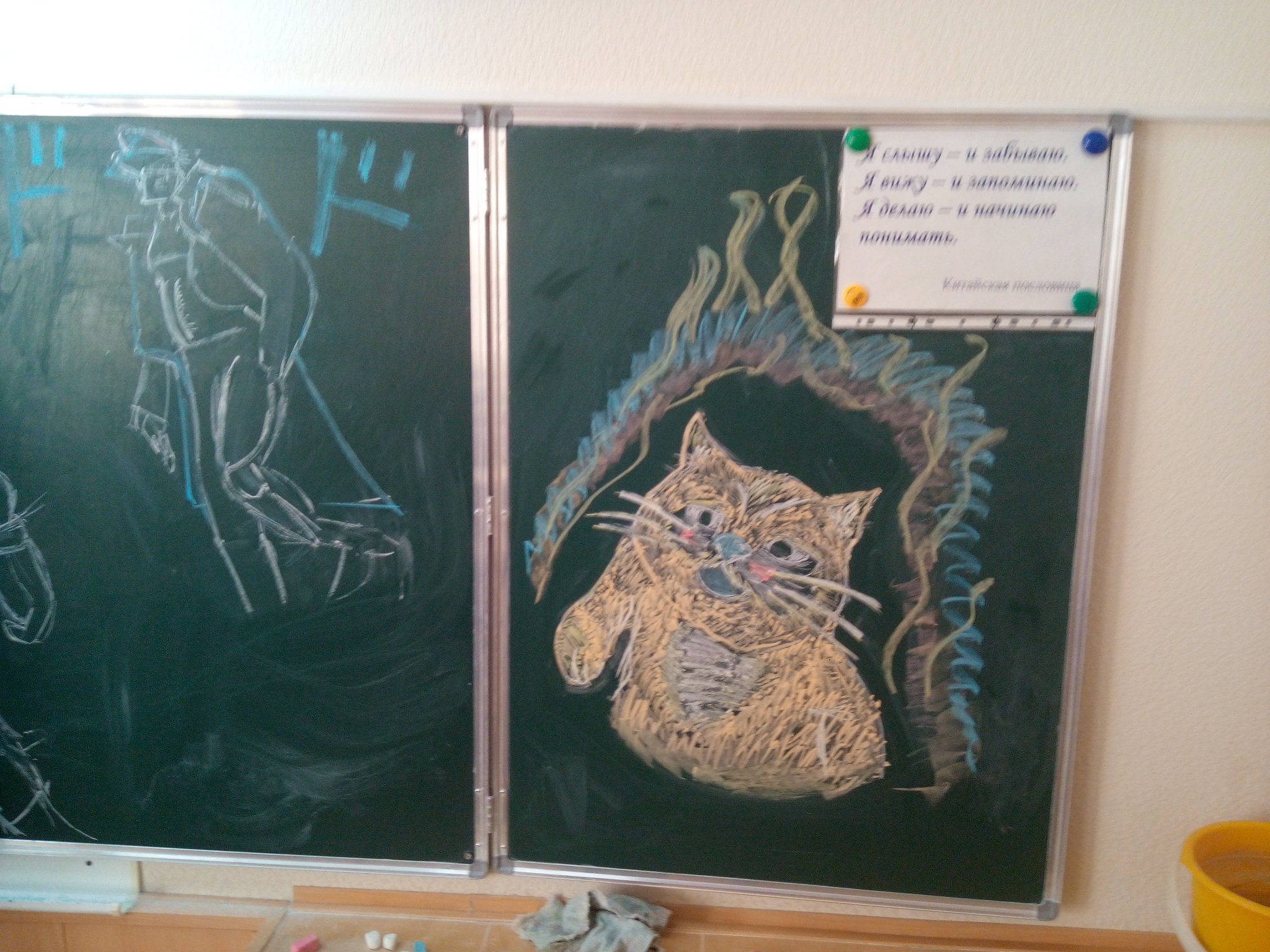 Перед каждым уроком алгебры-геометрии рисует картинки за 5-10 минут, я помогаю в работать в цвете (горжусь рыжим котом )
