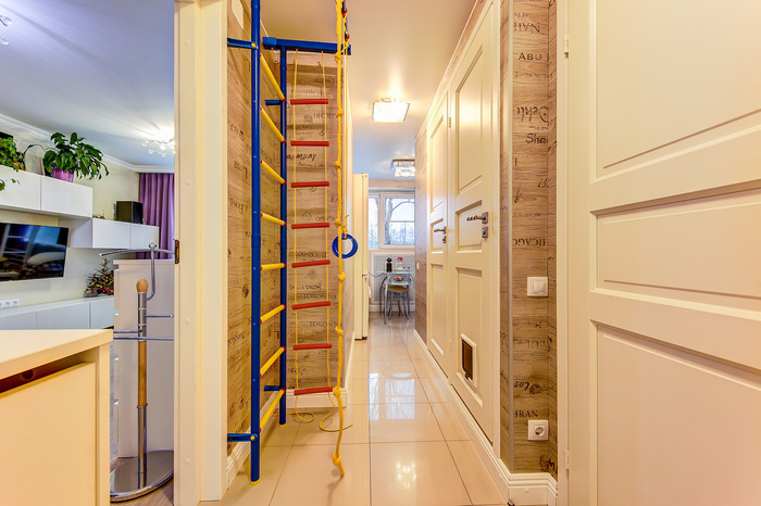 Для детей в коридоре выделили уголок и поставили шведскую стенку с канатом и кольцами. Хозяйка признается, что это место никогда не простаивает, дети там все время лазят, показывая родителям новые и новые кульбиты.