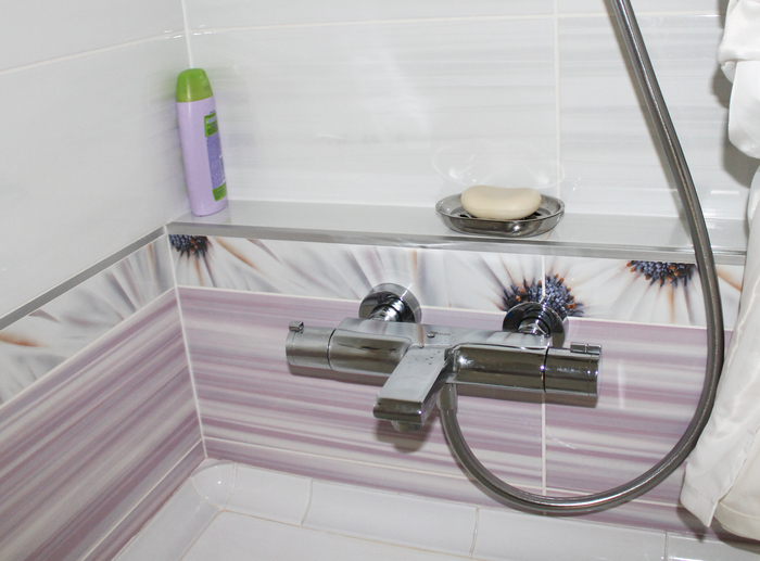 Заранее продумали полочку над ванной, для душевых принадлежностей, которые используются в момент принятия ванны или душа.