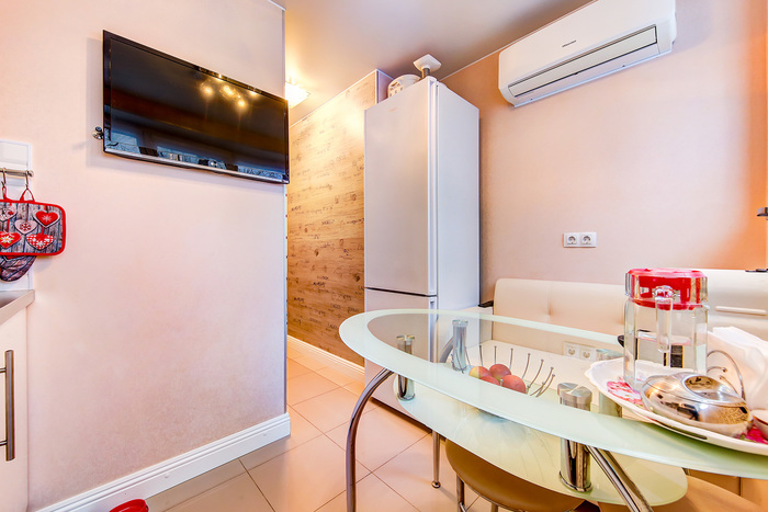 Холодильник поместили в углу. Место на холодильнике также не пустует, там стоят мясорубка, соковыжималка, мультиварка – в общем та техника, которая редко используется. Рядом расположились кожаный двухместный диван и стеклянный стол, который как бы растворяется в пространстве и визуально не занимает много места и табуретки, которые убираются под стол и не занимают места.