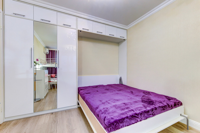 Изначально было принято решение, для экономии места, поставить шкаф-кровать. Это была заказная позиция, в шкафу специально продумывались полки под гладильную доску, утюг и пылесос. Также здесь хранятся постельное белье, вещи, документы, книги и всякая мелочь. Фасад шкафа зеркально-глянцевый. Кстати, на место установки шкафа укладывался керамогранит. Это было сделано для того, чтобы в случае замены ламината в комнате, шкаф-кровать не пришлось разбирать.