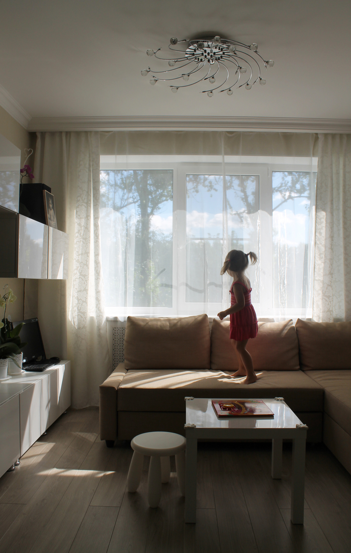 Изначально, когда только переехали в квартиру и дети были возрастом 1 месяц и 2 года, на месте двухъярусной кровати стоял угловой диван и детская кроватка.