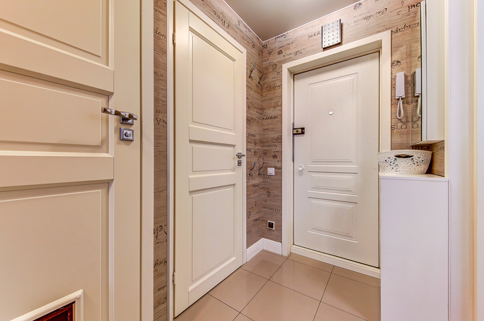 Входную дверь не меняли, заменили замок и наклеили дверную панель белого цвета с внутренней стороны квартиры, что позволило немного сэкономить.