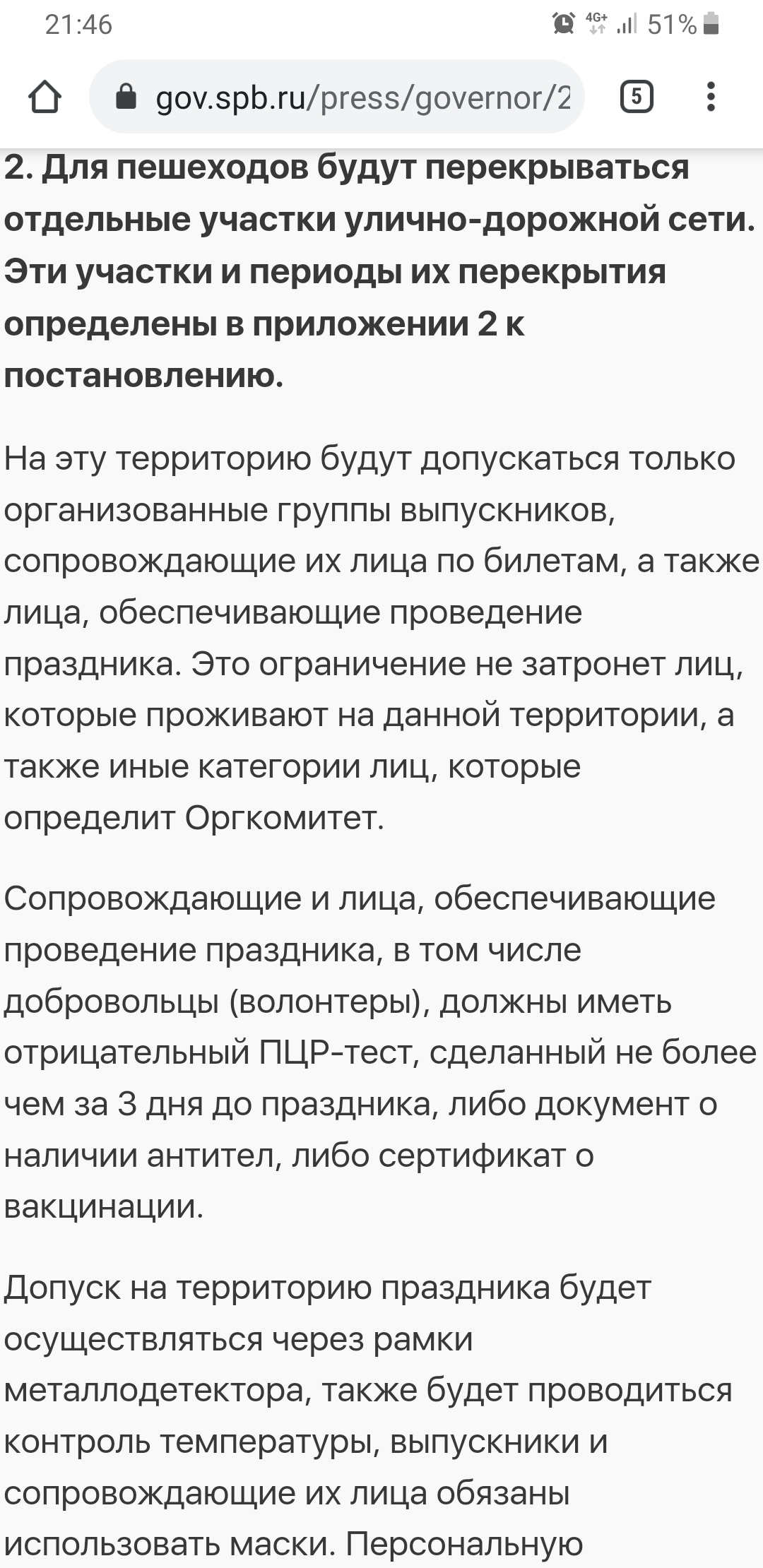 Посетить праздник смогут только организованные группы выпускников и их сопровождающие. Все лица должны быть в масках и иметь либо отрицательный тест ПЦР, сделанный не более, чем за 72 часа, либо документ о наличии антител, либо сертификат о вакцинации. Допуск на мероприятие будет осуществляться через рамки металлодетектора, на входе будет проверяться температура.