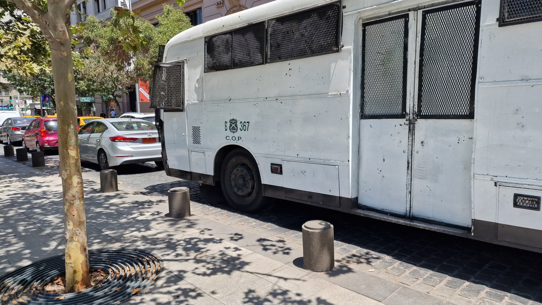 Дело в том что в Сантьяго, машины полицейских выглядят как броневик подвергшийся массированному обстрелу. Катерина рассказал, что они помяты из-за камней, которыми закидывали протестующе полицейские машины. Выглядит конечно жутковато, и невольно приходит мысль о том, что если тут полицейским так достаётся, то обычные люди наверное тут просто не выживают. :)