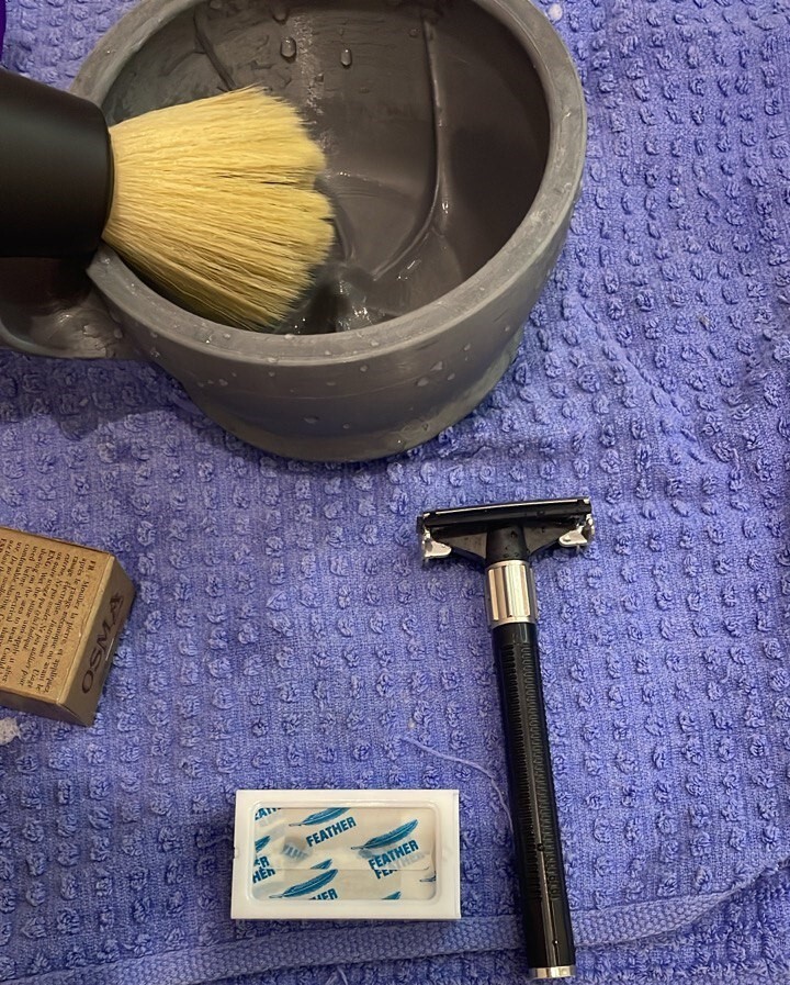 Вспомнил про станок Feather Popular. Было решено протестировать его с родными лезвиями, зарядил "перо" после первого использования в Futur. Процедура была не совсем комфортна, лезвие кусалось, при этом гладкости добиться не удалось. Еще пару раз пробовал его, но результат был примерно таким же.